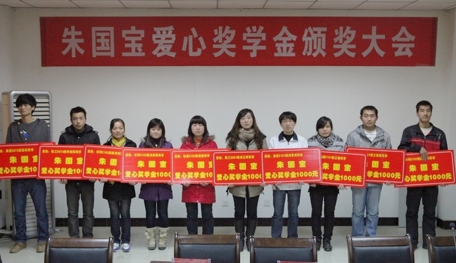 校友合作处处长段东旭对校友朱国宝先进事迹做了简要的介绍,学工部、学生处处长王庆东宣读了《关于颁发朱国宝爱心奖学金的决定》,出席大会的领导向获得爱心奖学金的学生颁发了奖牌和奖金。铁工5083班张永虎等10人获得我院首届“朱国宝爱心奖学金”,颁发奖金1000元/人。