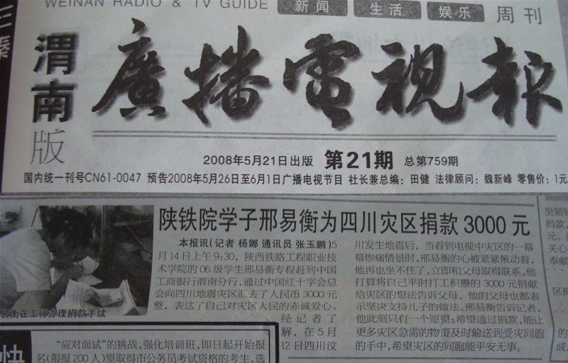 2008年5月21日渭南广播电视报题:陕铁院学子邢易衡为四川灾区捐款3000元