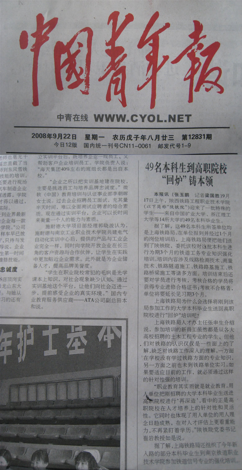 2008年9月22日中国青年报题:49名本科生到高职院校“回炉”铸本领