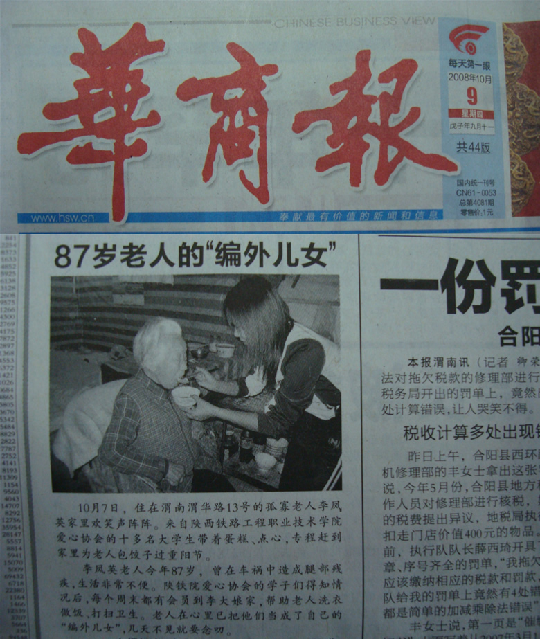2008年10月9日华商报A19版题:87岁老人的“编外儿女”