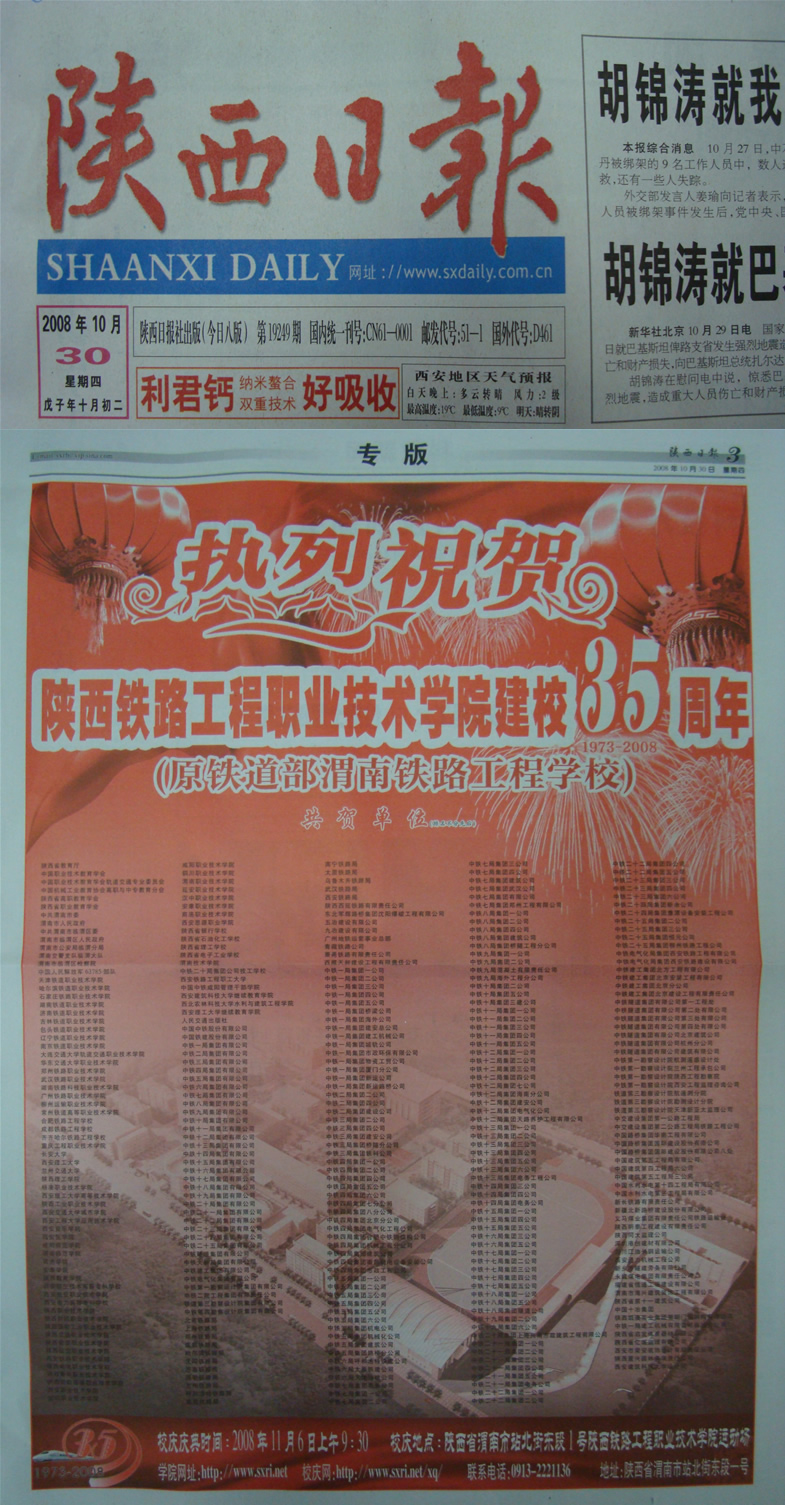 2008年10月30日陕西日报第三版题:热烈祝贺陕铁院建校35周年