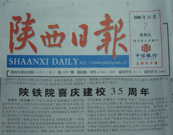2008年11月7日陕西日报第七版题:陕铁院喜迎建校35周年