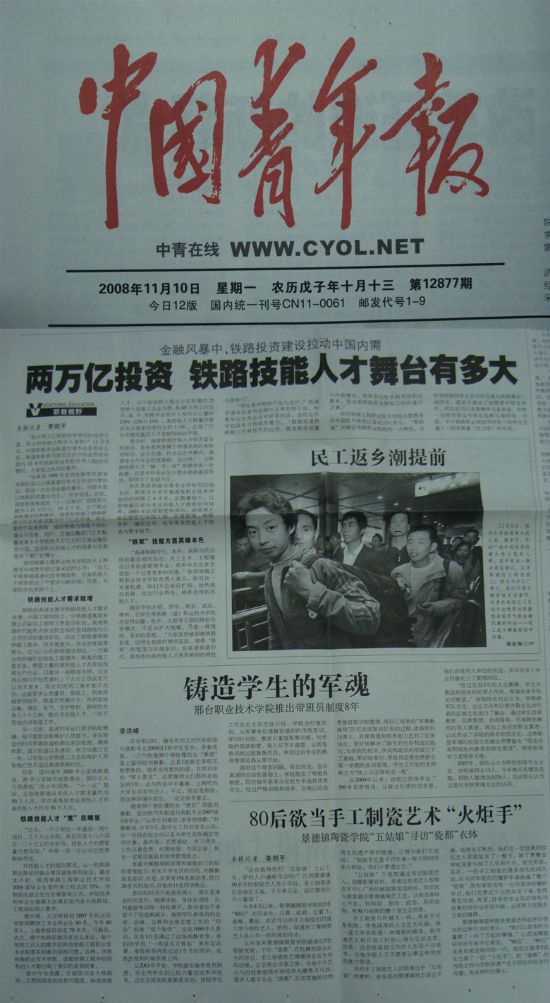 2008年11月10日中国青年报第十一版题:两万亿投资 铁路技能人才舞台有多大