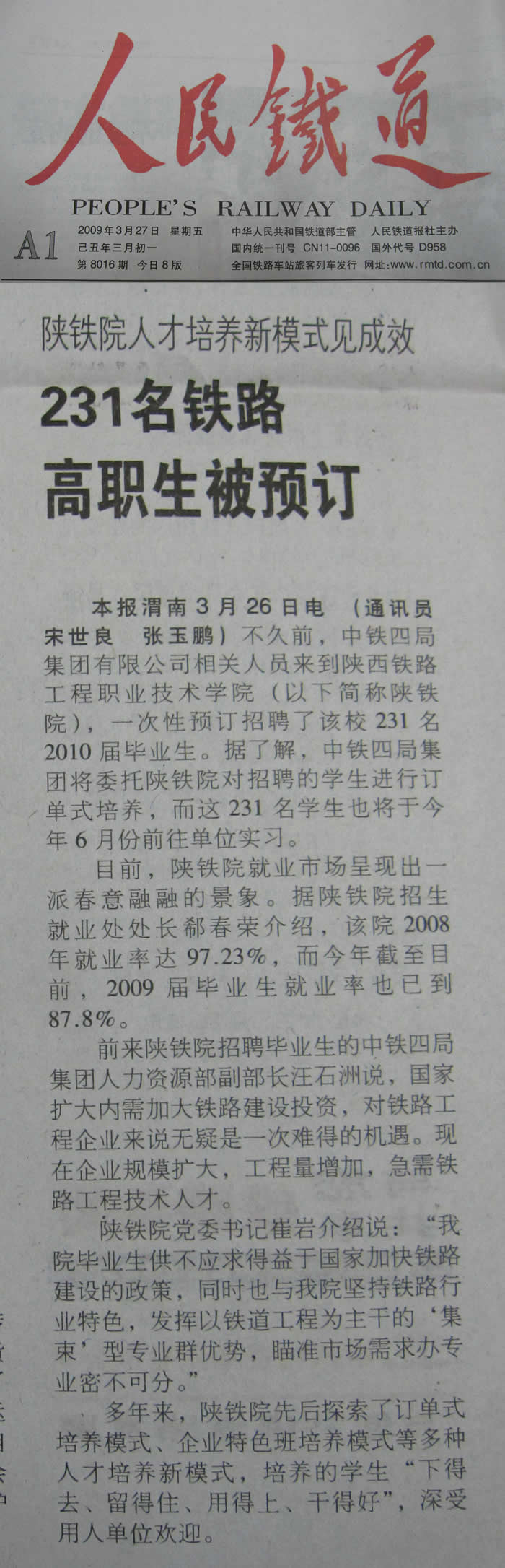 2009年3月27日人民铁道报第二版题:231名铁路高职生被预订