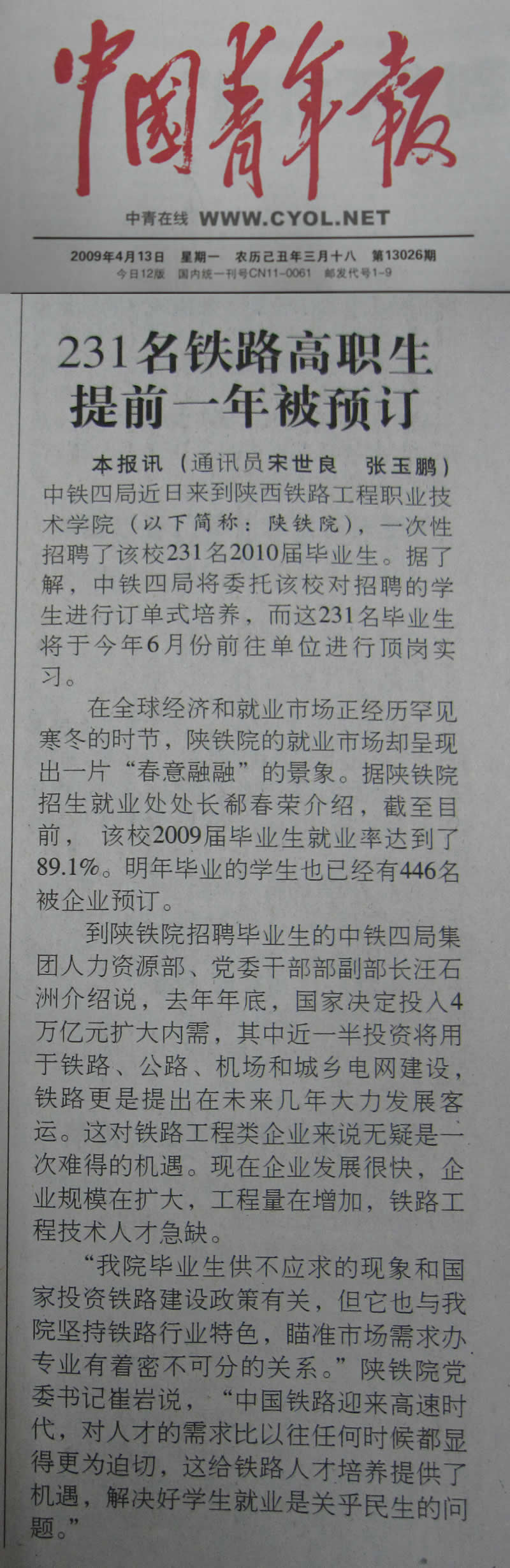 2009年4月13日中国青年报第十一版题:231名铁路高职生提前一年被预订