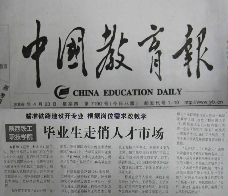 2009年4月23日中国教育报第二版题:陕西铁工职技学院毕业生走俏人才市场