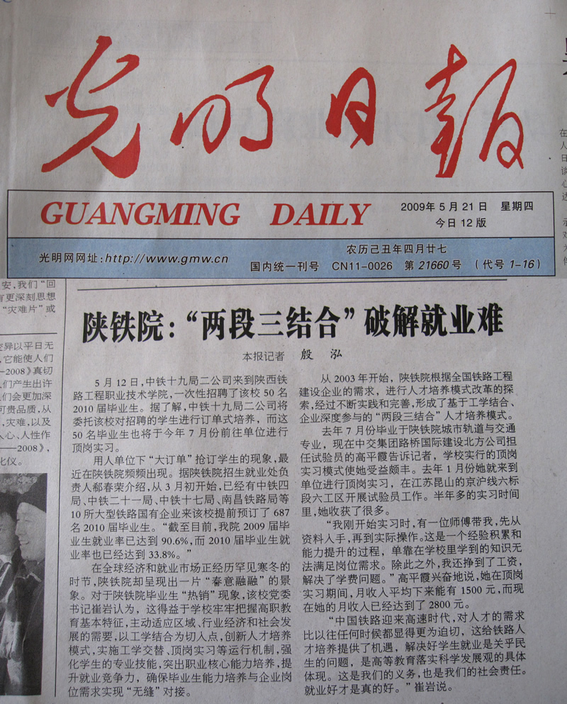 2009年5月21日光明日报第七版题:陕铁院:“两段三结合”破解就业难