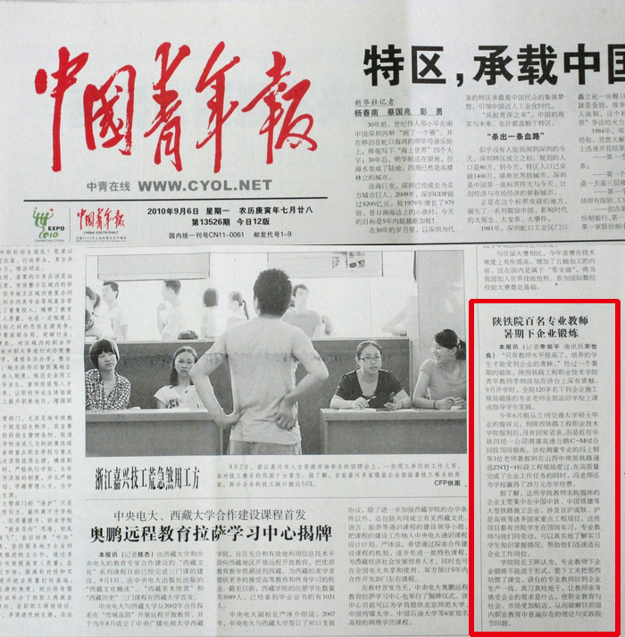 2010年9月6日中国青年报第十一版题:陕铁院百名专业教师暑期下企业锻炼
