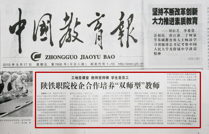 2010年9月17日中国教育报第二版题:陕铁院校企合作培养“双师型”教师