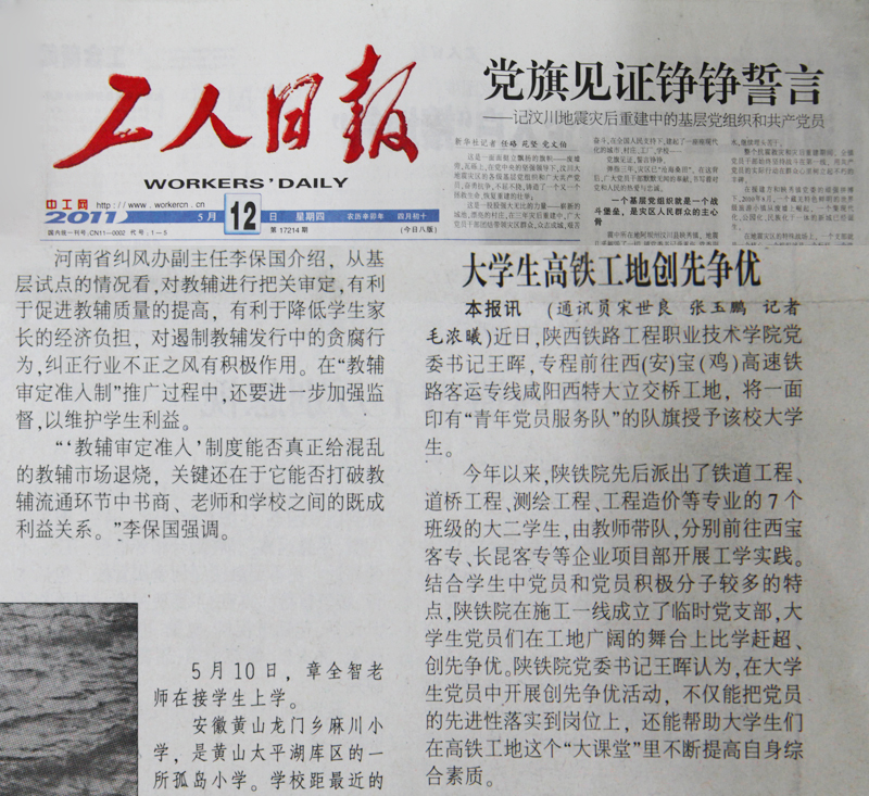 2011年5月12日工人日报第5版题:大学生高铁工地创先争优