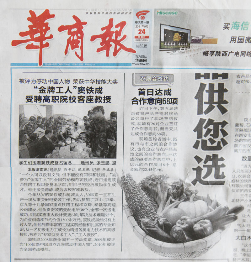 2011年9月24日华商报A10版题:“金牌工人”窦铁成受聘高职院校客座教授