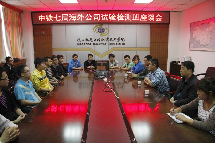 9月23日下午,中铁七局海外公司总经理、高级工程师曹洪超来到陕铁院,与该公司委托学院作试验检测专项培训的30名学员进行座谈,在听取了培训班学员近一个月的学习生活情况汇报后,曹洪超感谢学院为培训班所作的努力和工作,对培训效果表示非常满意,并希望与学院建立长期校企合作关系,共谋发展之路。 继续教育部、铁道工程系等部门负责人参加了座谈会。(齐红军) 会议现场