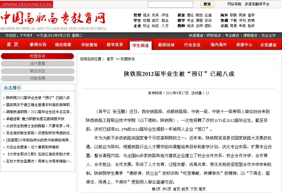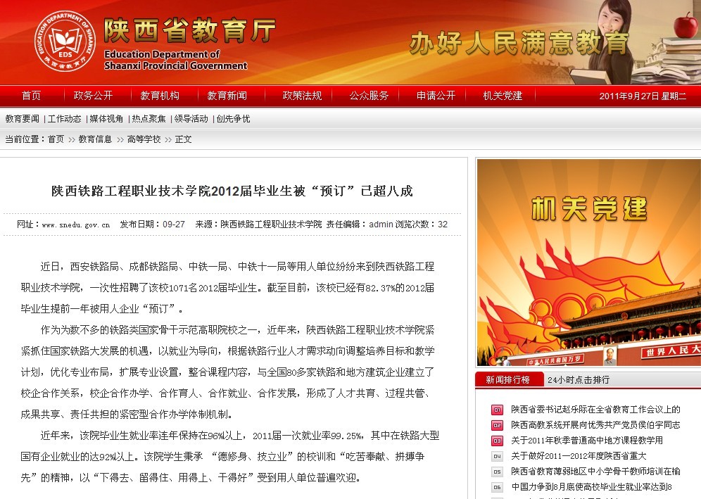 2011年9月27日陕西省教育厅网、中国高职高专教育网、华商网题:陕西铁路工程职业技术学院2012届毕业生被“预订”已超八成