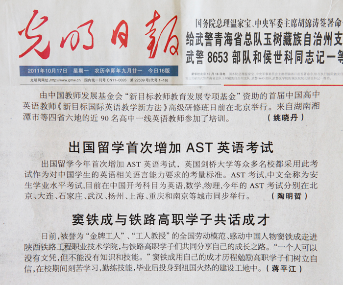 10月17日,《光明日报》教育时空版以“窦铁成与铁路高职学子共话成才”为题,报道了全国劳动模范窦铁成走进陕西铁路工程职业技术学院,与大学生们共话成才之路的消息。现将全文转载如下: