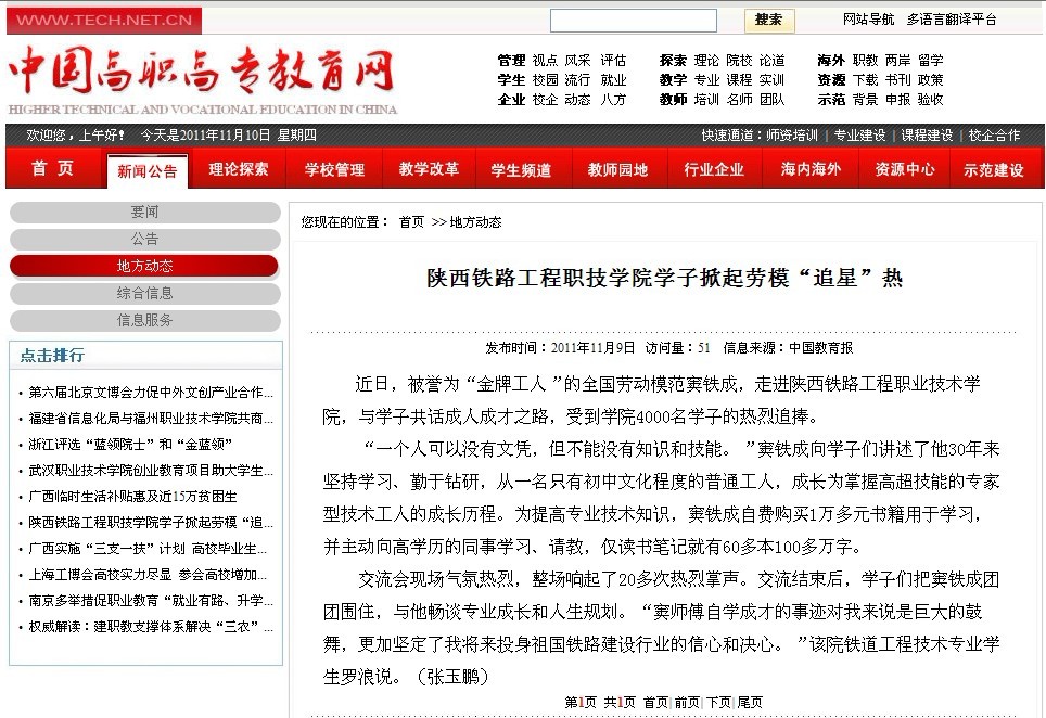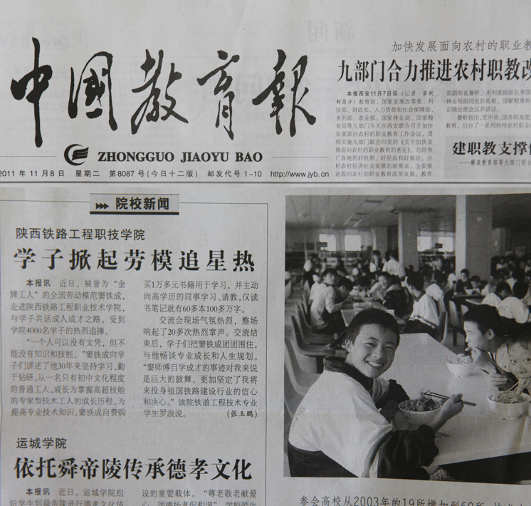 2011年11月8日中国教育报第二版、11月9日中国高职高专教育网题:陕西铁路工程职技学院学子掀起劳模追星热