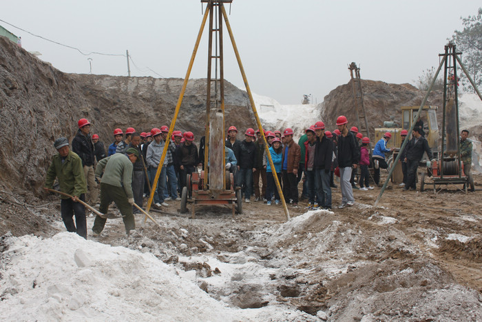 学生们在9号学生公寓基坑软土层处理现场学习和监督