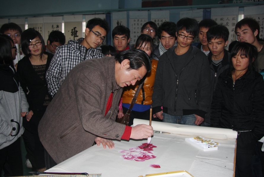 展厅内书画作品繁多,有楷书、隶书、小篆等书法作品,也有山水、花鸟等国画佳作。参观学生仔细地观赏每一幅作品,细细品味,驻足谈论。学院领导对书画展给予了高度评价,并和在场学生进行了亲切交流。4位书画专家还现场创作,一幅幅字画跃然纸上,受到了一致好评。(刘明学)