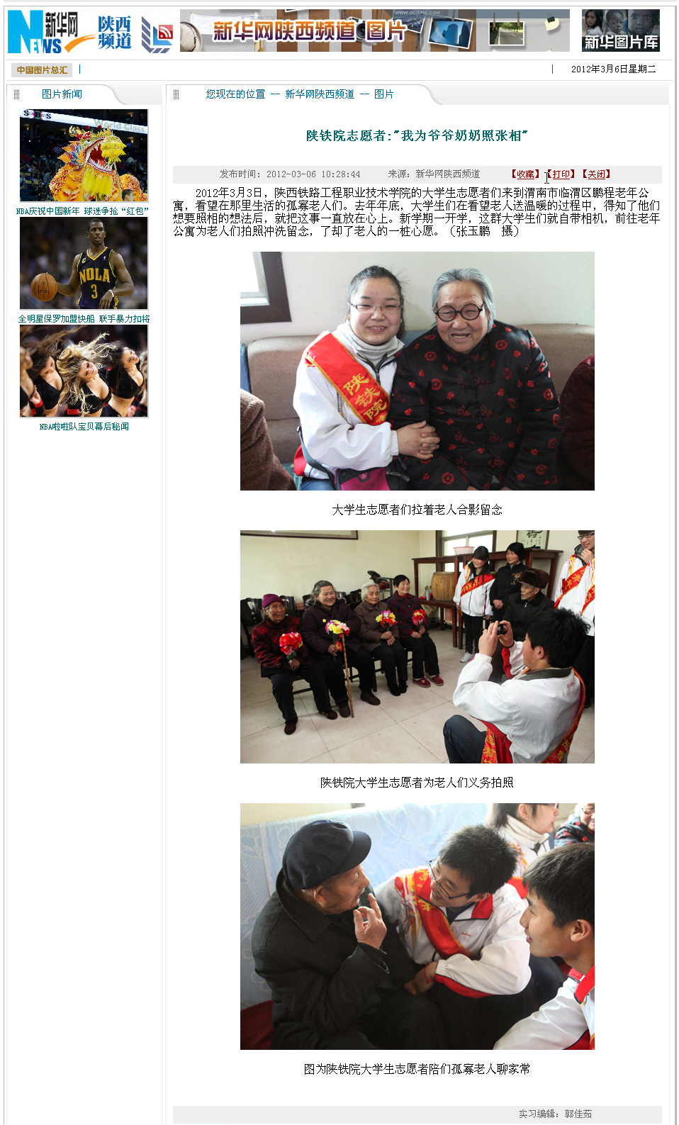 2012年3月6日新华网陕西频道题:陕铁院志愿者:我为爷爷奶奶照张相