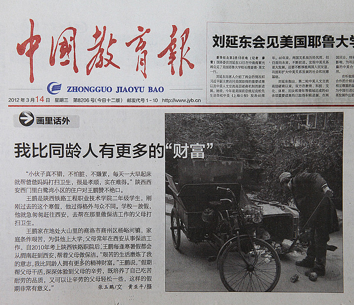 3月14日,《中国教育报》第七版以“我比同龄人有更多的‘财富’”为题,图文并茂地报道了陕西铁路工程职业技术学院大学生王鹏假期感恩父母的事迹。光明网、人民网、中国网、搜狐网等中央主流网络媒体也分别予以转载报道。现将全文转载如下: