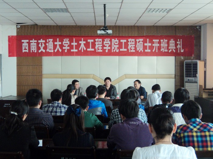 开班典礼现场 4月19日上午,学院与西南交通大学联合举办的工程硕士研究生班在学院12楼会议室正式开课。这批学员不仅有中铁系统各单位的项目经理、总工等高层管理人员,也有西铁职院和学院部分教师,共23人。 西南交大土木学院副院长任宝良、学院党委副书记车绪武及继续教育部负责人出席开班典礼。(齐红军)