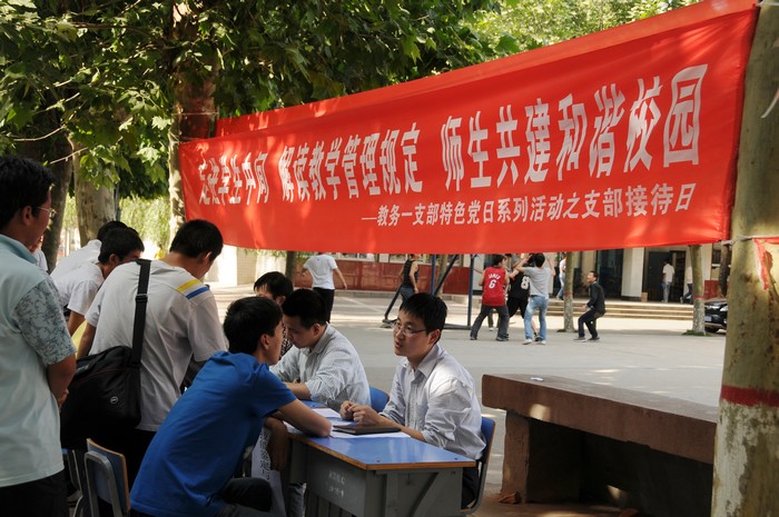 5月14日下午,学院教务一支部在学院小操场西侧举办了主题为“走进学生中间,解读教学管理规定,师生共建和谐校园”的“支部接待日”活动。