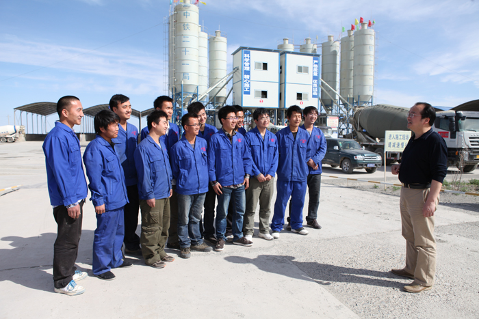 在项目部拌合站前与遇到的学生逐一交流,询问工作情况