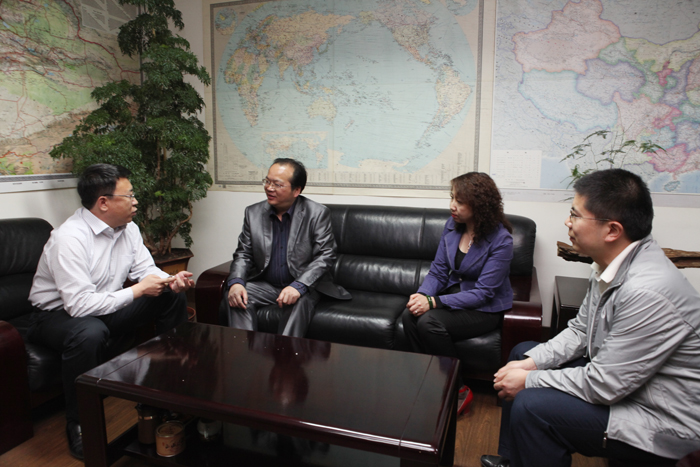 与中铁二十一局一公司董事长兼党委书记石龙海(左一)、公司劳动人事部部长代亚力(右一)、副部长杨海燕(右二)座谈交流