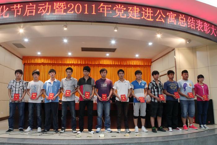 会上,学工部(处)处长王庆东宣读了《关于表彰2011年学生公寓党建先进个人的决定》。学生公寓管理中心主任回顾总结了2011年党建进公寓工作,并宣读了《第三届公寓文化节实施方案》。出席大会的领导向受表彰学生颁发了荣誉证书。