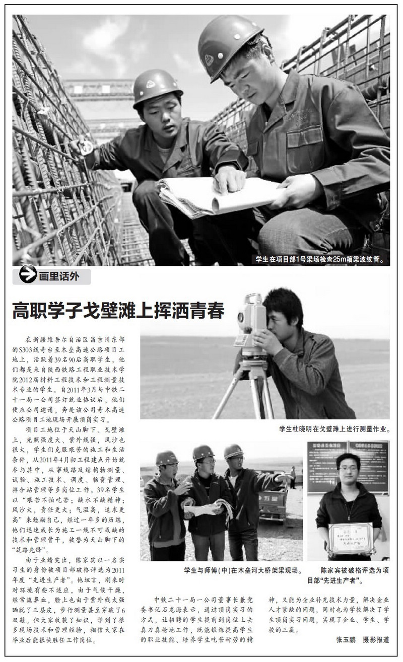 在中央新疆工作座谈会召开两周年之际,5月30日,第三次全国对口支援新疆工作会议在北京人民大会堂隆重举行。就在当天,《中国教育报》第六版以“高职学子戈壁滩上挥洒青春”为题,约占1/4版面的篇幅,图文并茂地报道了奋战在新疆奇木高速公路项目工地上的陕西铁路工程职业技术学院顶岗实习大学生群体的优秀事迹。人民网、新华网、中国教育新闻网、中国网、中国日报网、凤凰网、新民网等多家主流网络媒体纷纷予以转载报道,在社会上引起良好反响。现将全文转载如下: