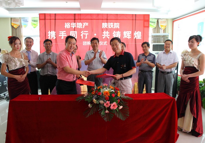6月8日上午,学院团购‘状元公馆’3号楼协议签约仪式在高新区幸福城售楼部举行。学院院长王长友、党委副书记杨云峰出席签约仪式,团购‘状元公馆’谈判小组成员陪同参加。 学院工会副主席王秦平代表学院与陕西裕华房地产开发有限公司签订了团购协议。(赵晓智) 学院与房地产公司签约