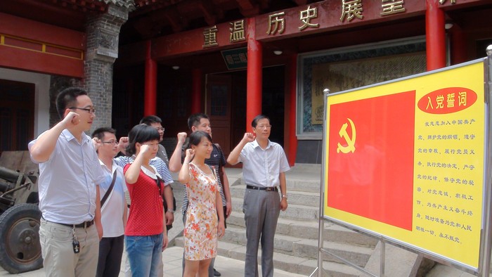 教工党员在讲解员的带领下,通过观看历史照片、实物,聆听讲解等方式,了解了革命英雄们英勇抗战的光辉事迹,深刻感受到当年红军在葛牌镇区成立苏维埃政府,开展了一系列革命活动和对敌斗争,对红军长征胜利到达陕北做出了积极贡献。参观完毕后,全体党员在轨道系党总支书记祝和意的带领下,面对鲜红的党旗重温了入党誓词,并与馆方举行了“陕铁院爱国主义教育基地”挂牌仪式。
