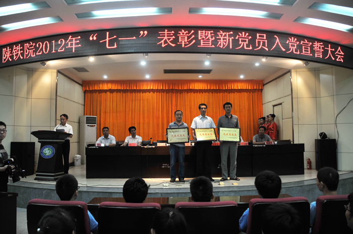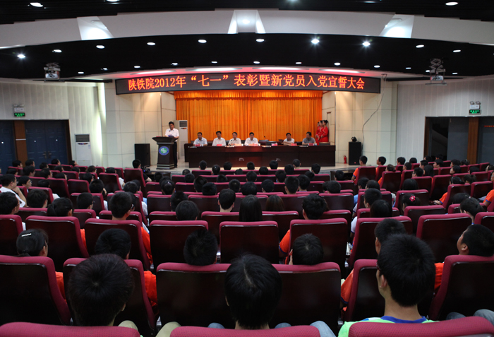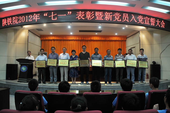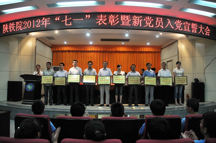 6月29日下午,学院党委在学术报告厅召开“七一”表彰暨新党员入党宣誓大会,热烈庆祝中国共产党建党91周年,隆重表彰一年来在学院改革发展中涌现出来的先进党总支、先进党支部和优秀共产党员、优秀党务工作者,并举行新党员入党宣誓。院党委书记王晖,院长王长友,院党委副书记车绪武,院党委副书记、纪委书记杨云峰,副院长王闯、焦胜军、李林军出席会议,全体教职工党员及部分学生党员参加了大会。会议由车绪武主持。