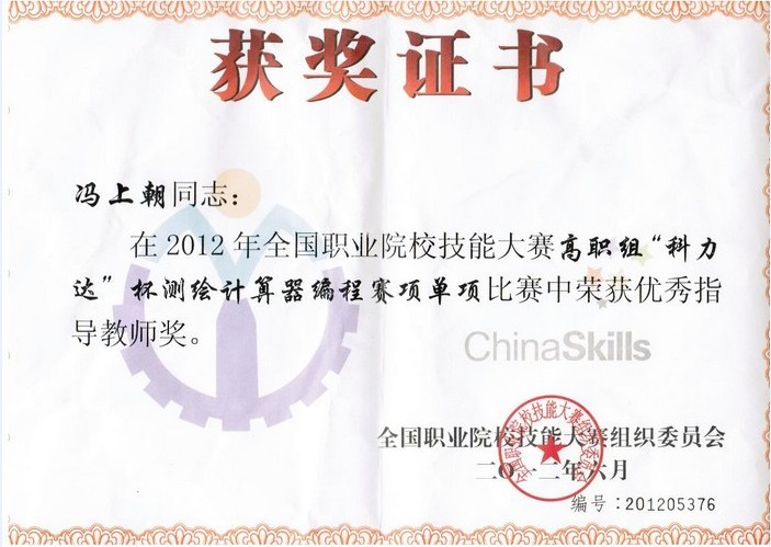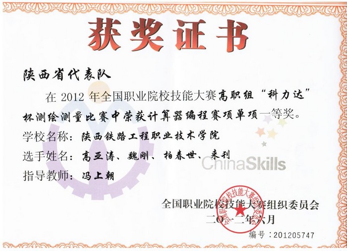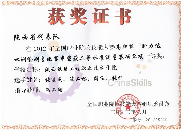 6月9日至28日,教育部联合天津市人民政府、人力资源和社会保障部等22个部门在天津、江苏等11个省(市、区)举办了2012年全国职业院校技能大赛。陕铁院选派8名队员组成2支代表队参加了此次比赛,在二等水准测量、测绘计算器编程、数字化测图三个单项和团体比赛中获一等奖3项、二等奖3项、三等奖2项和优秀指导教师奖2项。