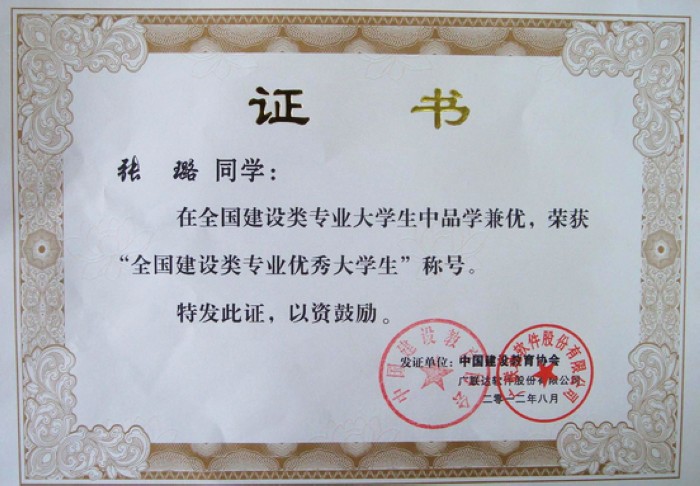 造价3101班张璐同学获“全国建设类优秀大学生”称号