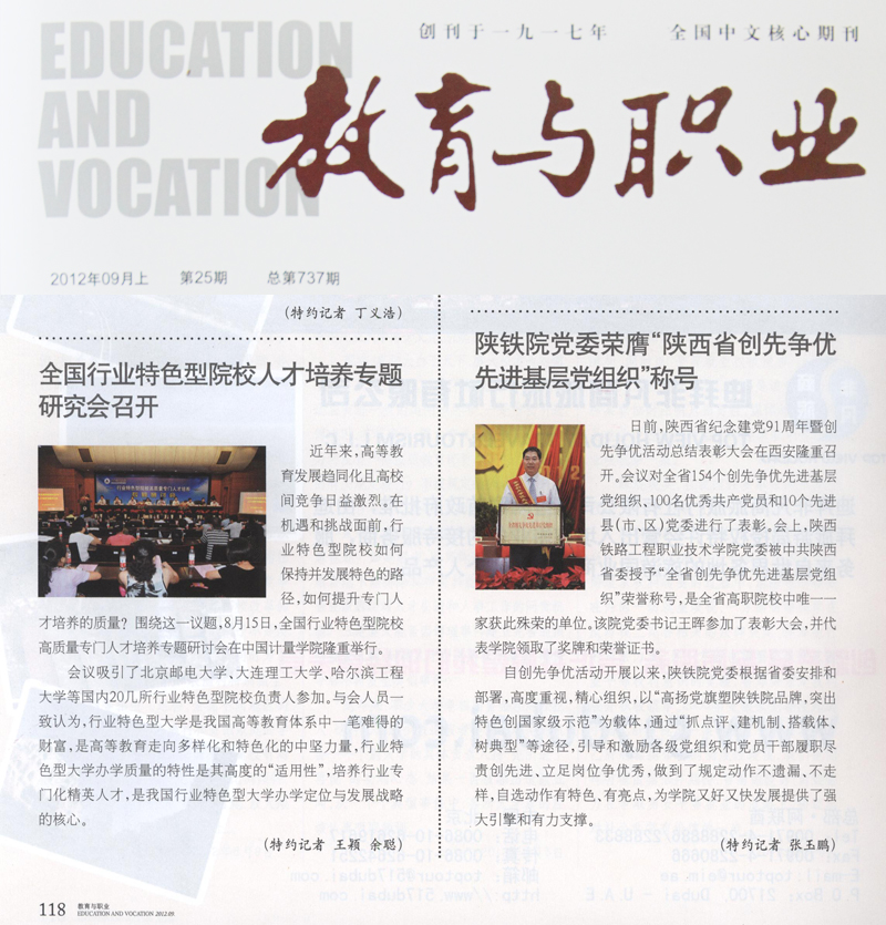 2012年9月第25期《教育与职业》杂志题:陕铁院党委荣膺“陕西省创先争优先进基层党组织”称号