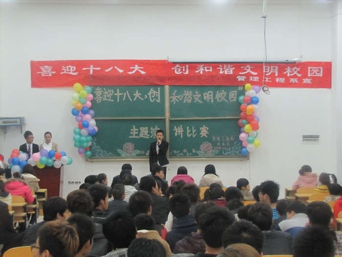 ◆管理系举办“喜迎十八大”系列活动。为了喜迎中国共产党第十八次全国代表大会胜利召开,管理工程系于10月底至11月初期间,组织了系列活动,通过开展“音乐点亮青春•歌声唱响未来”爱国歌曲大赛、观看爱国电影《开天辟地》、举办“喜迎十八大•创和谐文明校园”演讲比赛和PPT大赛等活动,使同学们重温了中国共产党走过的91年光辉历程,感受到了祖国发展的日新月异,深刻体会到幸福生活的来之不易。