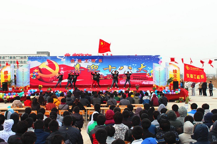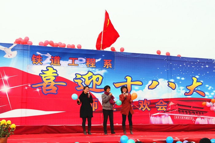 ◆铁工系举办“喜迎十八大”文艺晚会。11月7日、8日晚,铁道工程系分别在高新校区、临渭校区举办了“铁道工程系喜迎十八大文艺晚会”。院长王长友、院党委副书记车绪武、副院长王闯出席演出现场,高新校区管委会、组宣部、党政办、学生处、就业指导中心、各系部门负责人和铁工系师生一同观看了演出。