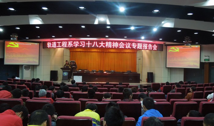 ◆轨道系举办学习十八大精神交流会。11月27日,轨道工程系在学术报告厅举办了全系学生学习十八大精神交流会。轨道系党总支书记祝和意在学习交流前,围绕十八大报告中的“三大亮点、六个改革方向、思想路线、五位一体、经济转变发展方式”等核心内容和亮点,向学生们作了解读。祝和意要求全体学生自觉坚持学习,进一步提高政治理论水平,在政治、思想和行动上始终与党中央保持一致。特别要求学生党员干部应充分发挥带头模范作用,为学院和系部建设发展积极贡献力量。随后,学生们纷纷上台,畅谈十八大精神学习心得。