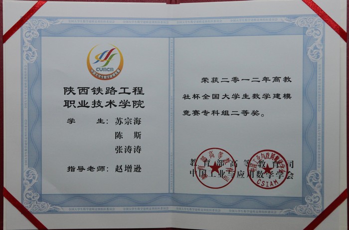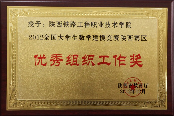 12月13日,全国大学生数学建模竞赛陕西赛区2012年颁奖仪式暨2013年动员大会在西安召开,省教育厅副巡视员王海波出席并讲话。陕铁院喜获国家二等奖1项,陕西省一等奖1项,陕西省二等奖5项,成功参赛奖5项。此外,学院因组织工作出色、竞赛成绩突出被省教育厅授予“陕西赛区优秀组织工作奖”,这是学院自2008年参加此项活动以来首次获此殊荣。