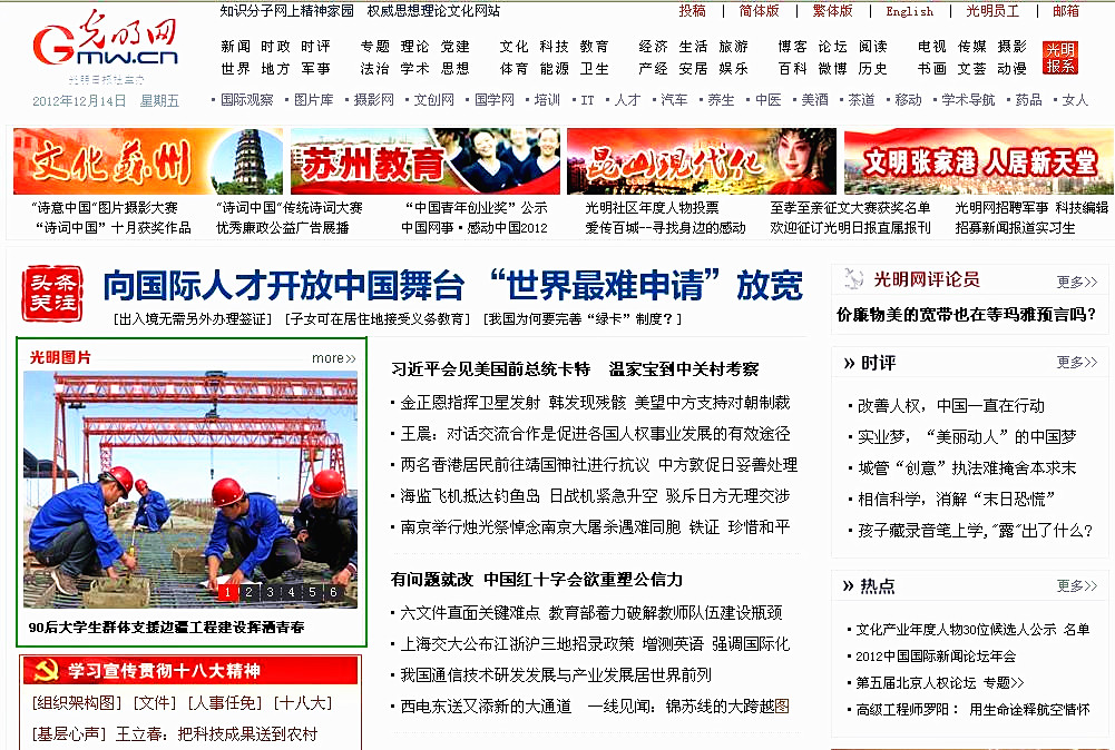 2012年12月14日光明网首页图片头条题:90后大学生群体支援边疆工程建设挥洒青春