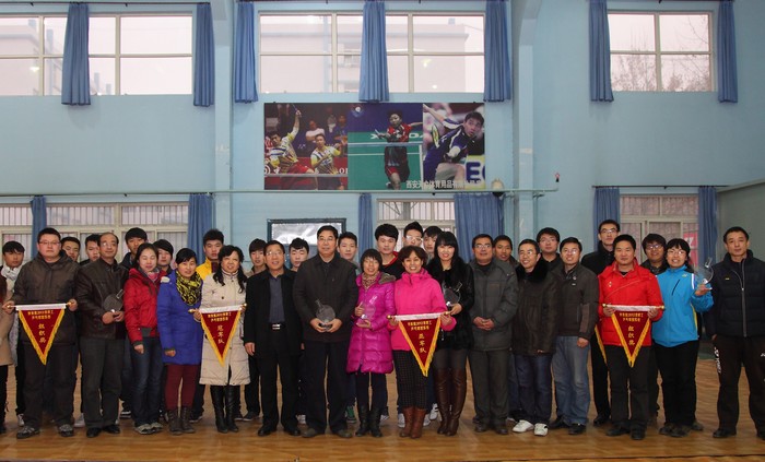 12月28日下午,陕西铁路工程职业技术学院2012年教职工乒乓球比赛颁奖仪式在临渭校区文体中心举行,院党委书记王晖、院党委副书记兼工会主席杨云峰现场为获奖代表队和男、女单打获奖选手颁发了奖旗和奖杯。