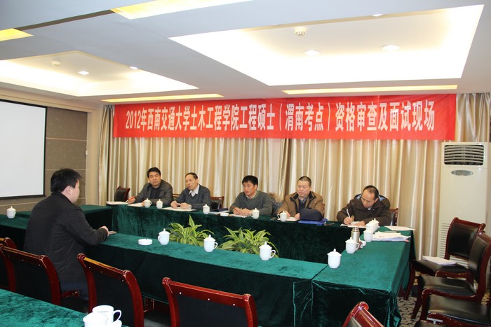 西南交大陕铁院考点2012年工程硕士考生正在进行面试 1月11日至12日,西南交通大学土木工程学院党委书记江富长,艾长发、罗忠贤教授一行三人组成考核组来到陕铁院,对在院报考西南交通大学工程硕士学位已通过初试的11位在职考生进行了第二阶段考试,现已全部结束。(齐红军)