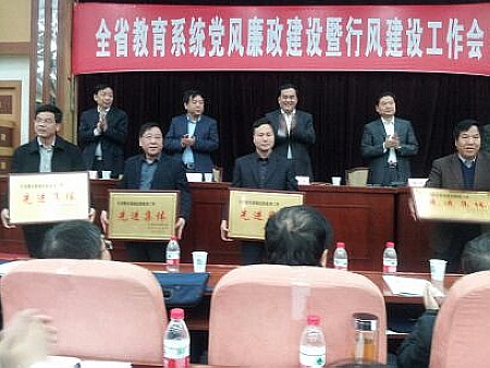 3月12日,全省教育系统党风廉政建设暨行风建设工作会议在西安召开,教育工委书记李仲为、教育厅厅长李兴旺、教育纪工委书记郝利生在会上讲话并为2012年度全省教育系统纪检监察先进集体和先进个人颁发奖牌。陕铁院荣获“2012年度全省教育系统纪检监察工作先进集体”荣誉称号。 学院党委书记王晖,党委副书记、纪委书记杨云峰等一行三人出席了会议。(张玉卓) 杨云峰(左二)代表学院上台领奖