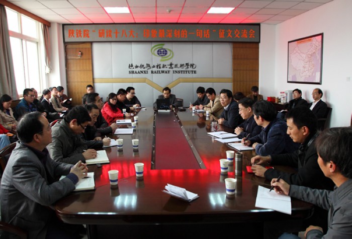 3月13日下午,陕铁院在十一楼会议室召开“研读十八大:印象最深刻的一句话”主题征文总结交流会。党委书记王晖,党委副书记车绪武,党委副书记、纪委书记、工会主席杨云峰,副院长焦胜军、李林军出席会议,各党总支(直属党支部)书记、各分会主席以及获奖人员共计40余人参加了会议。会议由杨云峰主持。