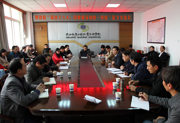 陕铁院这次主题征文活动是去年12月初在院工会的积极倡导和院党委的大力支持下开展起来的,征文对象以学院全体教职工党员、工会会员为主。征文活动中,学院各基层党组织、工会各分会高度重视,精心组织,广大党员干部、工会会员积极参与,踊跃撰稿投稿共72篇。交流会上,征文评审组代表发言认为:“本次主题征文清新别致,作品整体呈现出主题鲜明、联系实际、寓意深远、催人奋进的特点。虽说征的是‘一句话’,但参赛者为此必须认真通读十八大文献,还须通过思考、联系实际、进行对比分析,此过程比然加深对十八大精神的理解和认识,不失为一种行之有效的学习方式。”