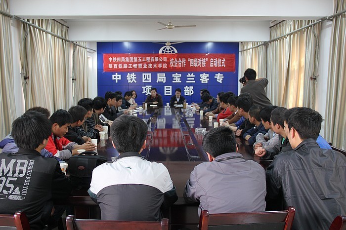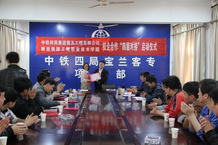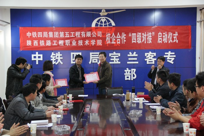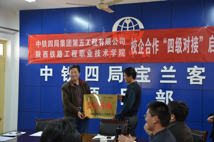 3月19日,陕铁院和中铁四局五公司在宝兰客专项目部举行“四级对接”签字仪式,并建立校外实训基地。陕铁院副院长焦胜军,中铁四局五公司总工程师杨铭、人力资源部部长安海涛、宝兰客专项目部总工程师栾光浩及各工区负责人出席了签字仪式。