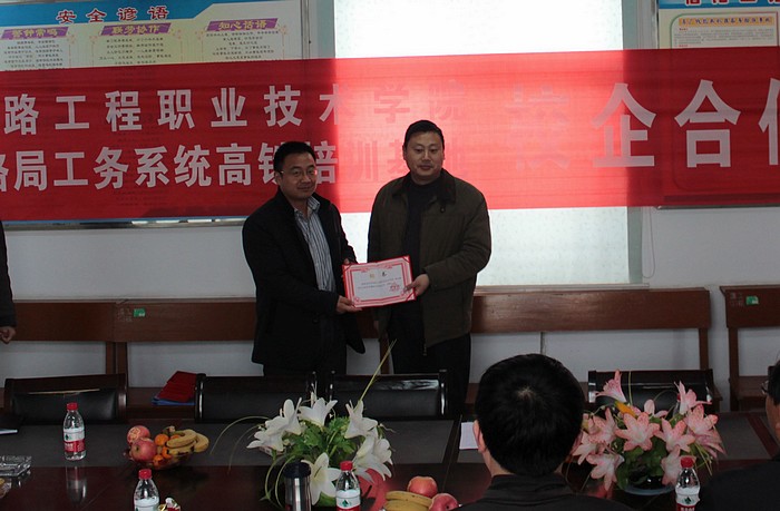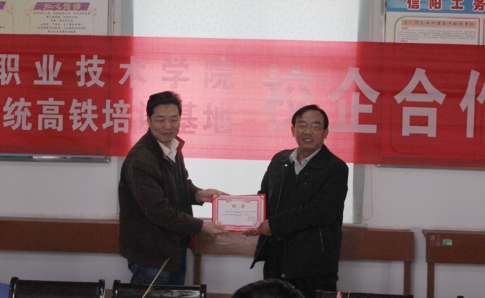 焦胜军与张红宾签订了校企联合成立“高速铁路维管培训基地”合作协议书,双方领导分别为校企互聘人员颁发了聘书。铁工系负责人与张红宾签订了校企对接合作协议书。高铁教研室主任方筠、铁道维护教研室主任周永胜分别被聘为信阳工务段驻马店西客运专线线路车间、漯河线路车间兼职副主任;安宏科等四名骨干教师被聘为车间兼职技术员。张红宾被聘为铁道工程技术(工务)专业建设指导委员会委员;程卫国、付健分别被聘为铁道维护教研室及高铁教研室兼职教研室副主任;全国劳模漯河线路车间王军礼等4名车间技术人员被聘为校外兼职教师。