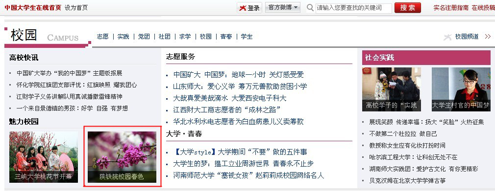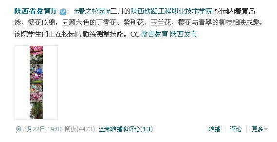 三月的陕西铁路工程职业技术学院校园内春意盎然、繁花似锦,五颜六色的丁香花、紫荆花、玉兰花、樱花与青翠的柳枝相映成趣,该院学生们沐浴着春风,在校园内勤练测量技能,播种春天的希望,追逐秋天果实满枝的学子之梦。(张玉鹏 摄) 网站截图 陕西省教育厅官方微博报道截图