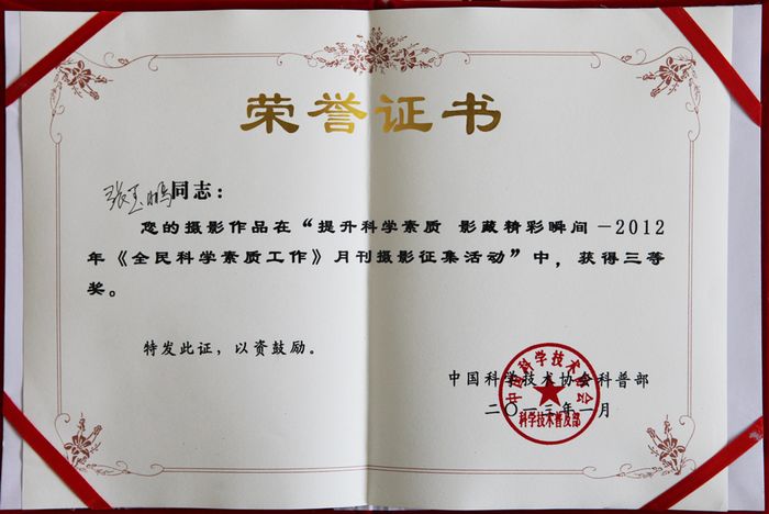 近日,由中国科学技术协会主办的2012年全国科普类摄影作品大赛评比结果在京揭晓。陕西铁路工程职业技术学院党委宣传部张玉鹏同志的摄影作品在本次大赛中荣获三等奖。