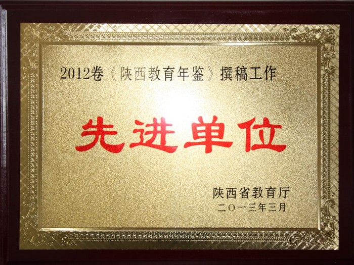4月23日上午,省教育厅在西安召开“全省教育年鉴工作会议”, 大会对2012年度撰稿工作先进单位进行了表彰。陕铁院被评为《陕西教育年鉴》2012卷撰稿工作“先进单位”。 会上,省政府教育督导团总督学曹普选对2012年度陕西教育志、教育年鉴编撰工作做了系统总结,并对2013工作进行了安排部署。全省各市、县(区)教育局主管编撰工作局长,各高等院校、厅属中专学校主管编撰工作校(院)长和厅属单位负责人等300余人参加了会议。(毛华东) 荣誉奖牌
